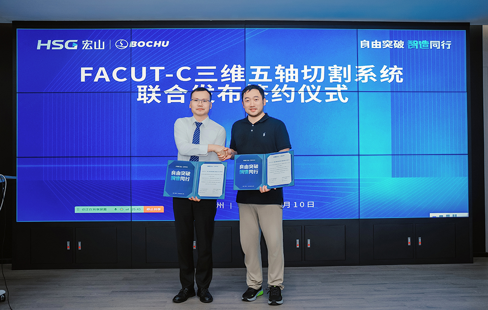 6月10日,宏山激光長三角總部蘇州基地迎來高光時刻——宏山激光攜手上海柏楚電子科技股份有限公司,聯(lián)合發(fā)布FACut-C三維五軸激光切割系統(tǒng),標志著雙方在高端激光裝備與運動控制系統(tǒng)領(lǐng)域的深度合作取得了階段性成果,也代表國產(chǎn)三維五軸系統(tǒng)在“自主可控、系統(tǒng)集成、平臺化發(fā)展”路徑上實現(xiàn)關(guān)鍵性突破。
