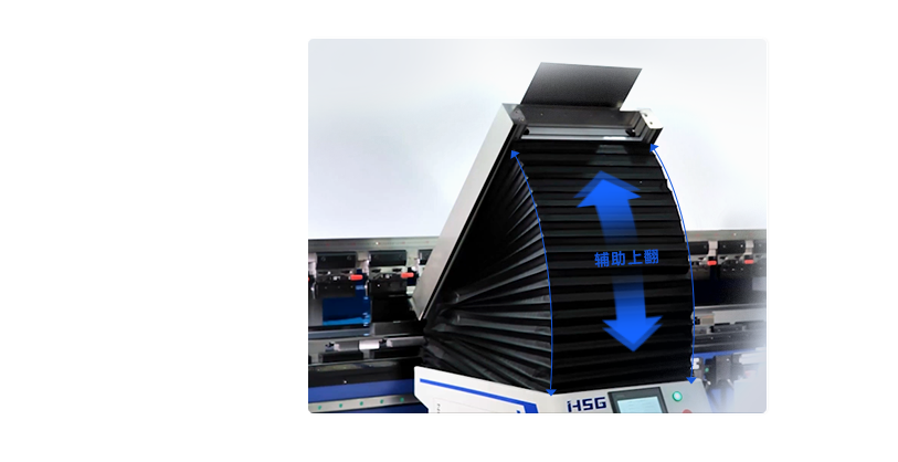 折彎大面積鈑金的時候,往往需要4~6人才能操作一臺折彎機。采用隨動托料裝置,可輔助折彎工人在折彎過程中做上翻動作,從而節省人工。