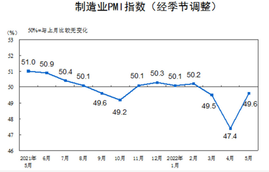 據(jù)國家統(tǒng)計局、中國物流與采購聯(lián)合會發(fā)布,2022年5月中國制造業(yè)采購經(jīng)理指數(shù)為49.6%,相較于4月回升2.2%。這表明前期疫情形勢和國際局勢等因素對經(jīng)濟運行造成的較大沖擊,隨著高效統(tǒng)籌疫情防控和經(jīng)濟社會發(fā)展逐漸改善。